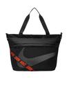 This tote provides ample storage with a spacious main compartment that has organizational pockets and a laptop sleeve. The zippered top protects your essentials from the elements. 66/34 nylon/polyester Zippered main compartment provides wide-open storage and easy access Easy-to-grab dual handles and an adjustable, removable crossbody strap give versatile carrying options Secure mesh pocket in back for shoe storage with added breathability A water-resistant coating on bottom panel helps keep gear dry Contrast welded Swoosh design trademark Laptop sleeve fits most 15' laptops Dimensions: 14'h x 22'w x 8'd; Approx. 2,464 cubic inches
